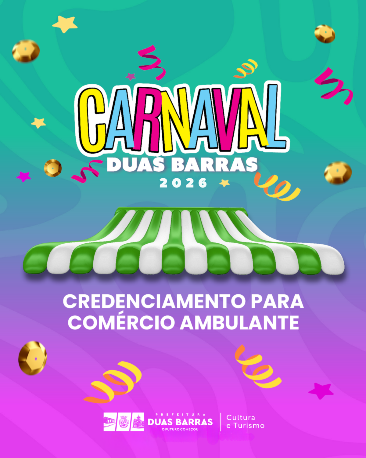 A Prefeitura Municipal de Duas Barras informa que estão disponíveis no Diário Oficial dos Municípios do Estado do Rio de Janeiro (AEMERJ) duas publicações referentes ao credenciamento de ambulantes para atuação durante o Carnaval 2026, com concessão de licença temporária para utilização de espaços públicos.