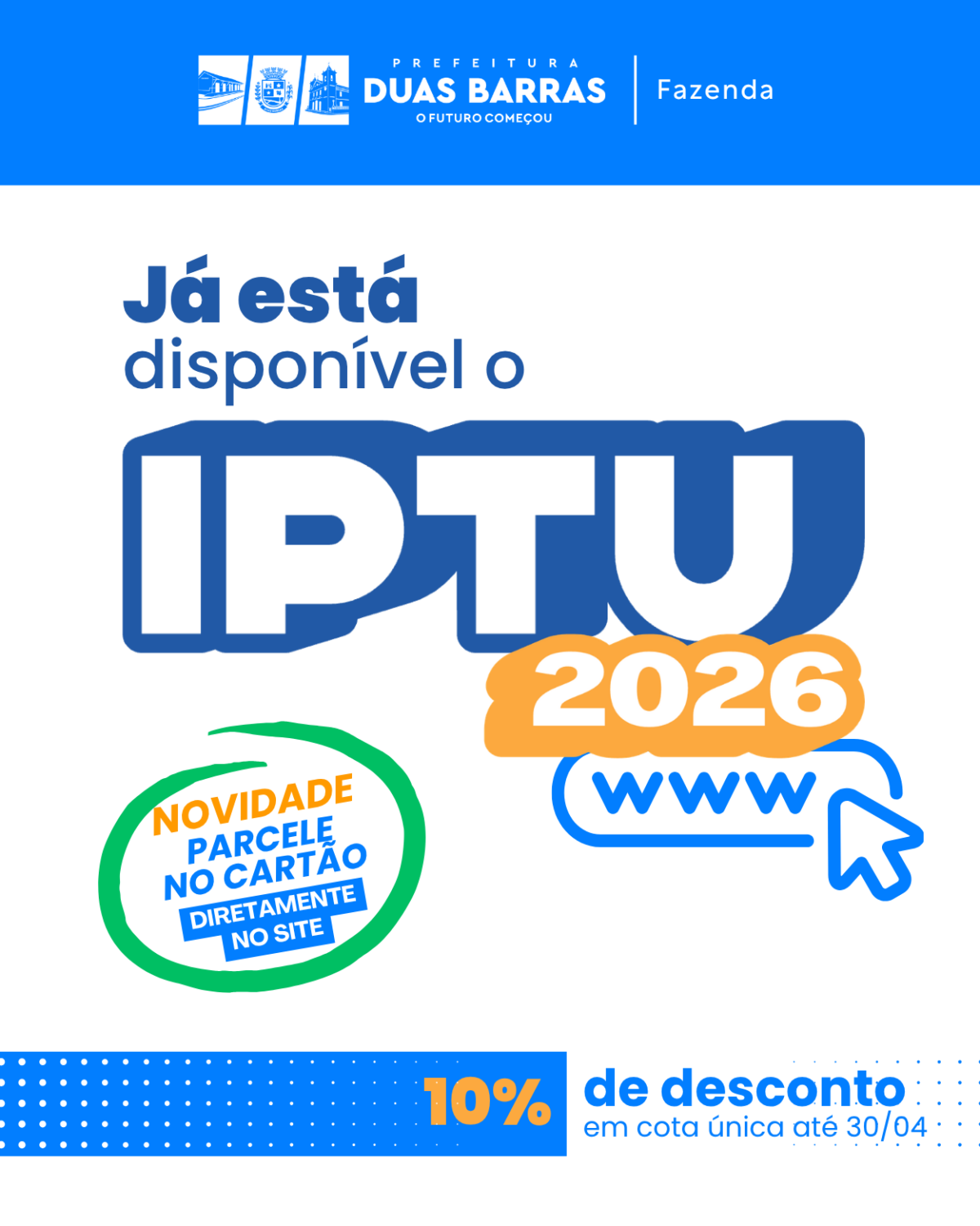 Os carnês poderão ser retirados na sede da Prefeitura Municipal, localizada na Praça Governador Portela, nº 07, Centro, até o dia 24 de abril de 2026. Também é possível emitir a guia ou segunda via por meio do site oficial do município: