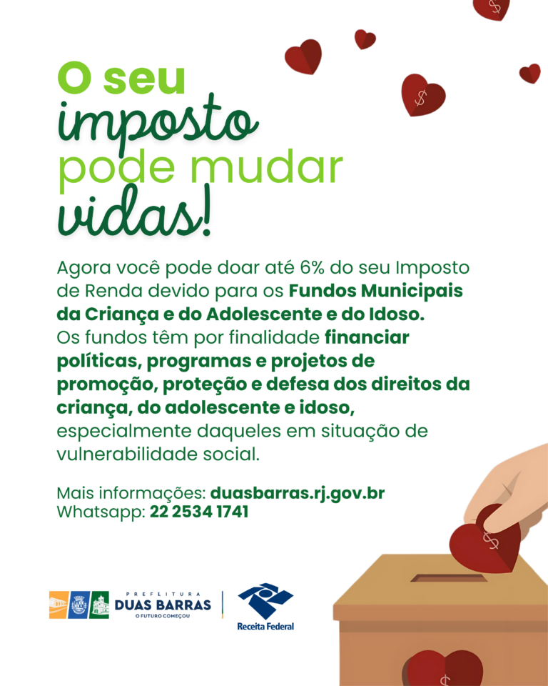 Você sabia que é possível direcionar parte do seu Imposto de Renda para os Fundos Municipais da Criança e do Adolescente e da Pessoa Idosa de Duas Barras? Essa é uma oportunidade segura, legal e sem custos adicionais para apoiar projetos sociais do município e, ao mesmo tempo, reduzir o valor destinado à Receita Federal. […]