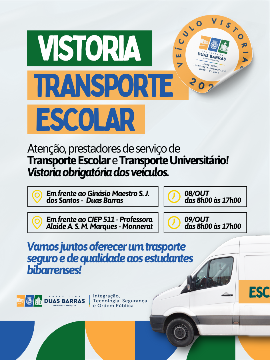 A Prefeitura Municipal de Duas Barras, por meio da Secretaria de Integração, Tecnologia, Segurança e Ordem Pública, convoca todos os prestadores de serviços de transporte escolar e universitário para a realização da vistoria obrigatória dos veículos, conforme cronograma abaixo: